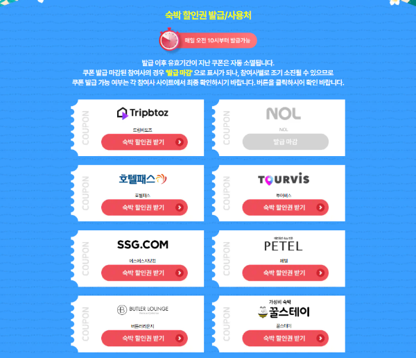 - 매일 오전 10시에 지정 여행사 사이트(11번가, G마켓, 하나투어 등) 접속