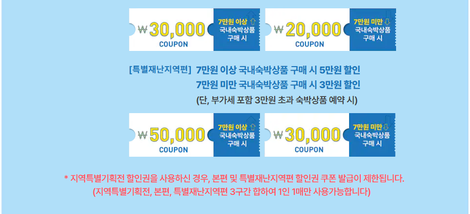 - 🛏️ 재난지역편 쿠폰: 지정된 10개 지역 숙소에서만 사용 가능